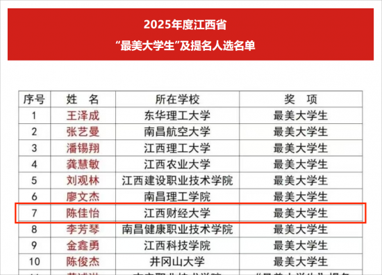 近日,江西省教育厅公布2025年度江西省“最美大学生”评选结果,十大体育投注网站排名 2022级国际经济与贸易专业2班陈佳怡同学光荣入选,成为全省获此殊荣的10名本科生之一。