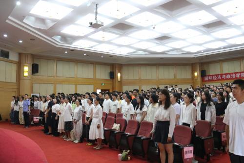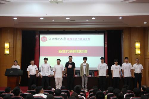 随后,学院领导为新生代表佩戴校徽,寓意着2025级新生正式成为江财国际经政人,肩负起传承学院精神的责任。