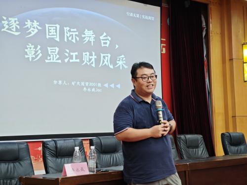 在下午的企业代表与校友代表分享环节中,杭州利贸企业管理咨询有限公司创始人李永成先生以“逐梦国际舞台,彰显国经政风采”为题,用求学创业故事串起全球变局,生动解析了国际视野与销售能力如何助力国贸新人把课堂知识转化为订单,赢得全场掌声。